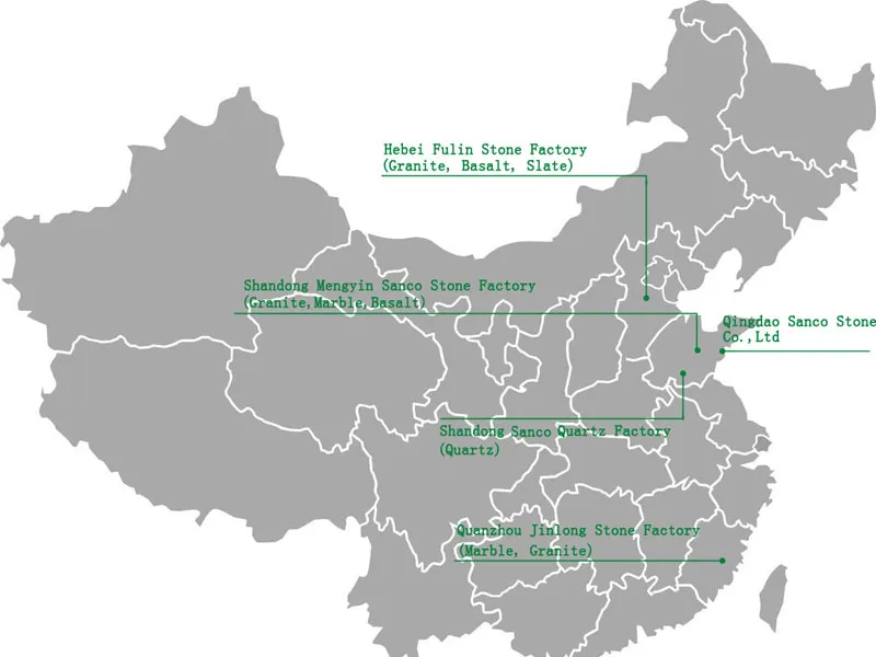 Qingdao Sanco Stone Co., Ltd. (its predecessor Qingdao Yinhui Stone Factory, is a Sino-Japanese joint venture) was established in 1993. Existing a trading companies (located in the beautiful coastal city of Qingdao), Sales team, quality control team and after-sales service team are here to provide thoughtful service to our customers at any time.A large stone factory (Shandong Mengyin Sanco Stone Factory), An Artificial Quartz factory (Shandong Sanco Quartz Factory), and two small stone Factories (located in Hebei and Fujian).